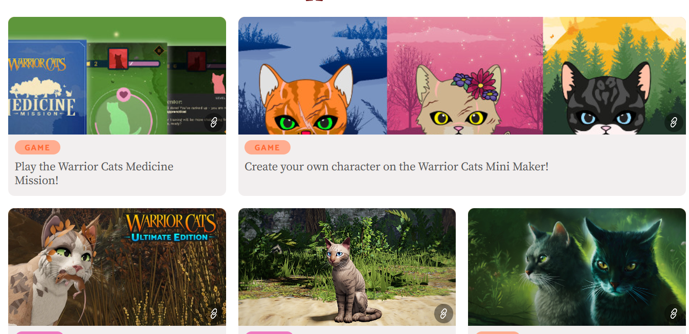 Official Browser Games & Quizzes Warrior Cats Medicine Mission – Mix herbs to treat injured cats. Warrior Cats Mini Maker – Customize and create your own Warrior Cat character. Which Warrior Cat Are You? quiz – Personality quiz to discover your inner cat persona. Moonpool visit – A little interactive “mystery quest” mini‑game. Plus activity sheets and Clan‑related quizzes.